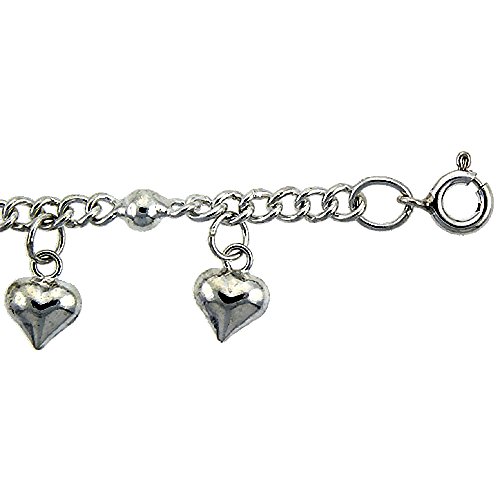 -. Title : Sterling Silver Anklet with Beads and Dangling Hearts, fits 9 - 10 inch ankles