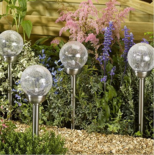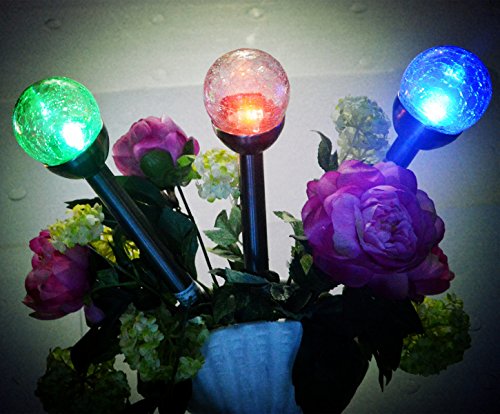 - BEAUTIFUL:Cool tones radiate off from the crackle glass solar light, perfect for garden decor or yard decorations.Set of 3 dazzling globe lights includes three colors guaranteed to liven up any yard, garden, or landscape.