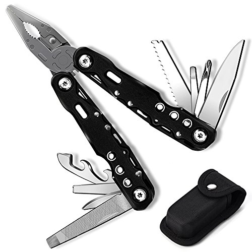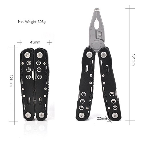 12 Features in One Multitool: Needle nose pliers, regular pliers, wire cutters / stripper, can opener/bottle opener, medium screwdriver, leather punch, large screwdriver, nail file(double side), fish hook remover, small screwdriver, cross screwdriver, large knife blade.