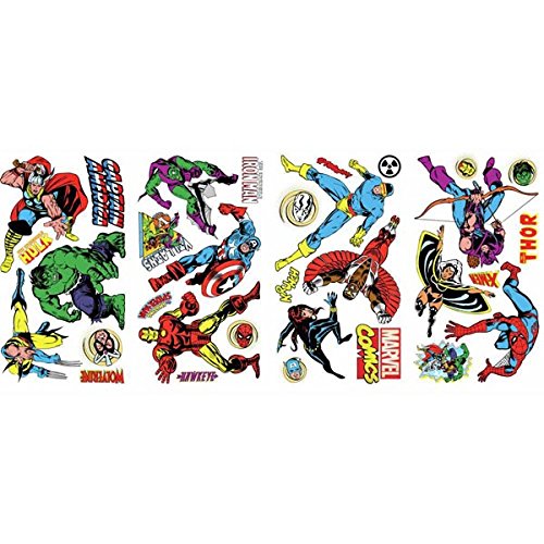 -. Binding : Tools & Home Improvement -. Brand : RoomMates -. Color : Marvel Classics -. EAN : 0885374890712 -. Feature : Comes with 32 decals; Decals range in size 3"wide x .8"high to 7.5"wide x 9"high / Easy to apply - just peel and stick / Applies to any smooth surface / Decals are removable and repositionable with no sticky residue / Wall Decals made in the USA -. IsAutographed : 0 -. Label : RoomMates -. Manufacturer : RoomMates -. Model : RMK2328SCS -. MPN : RMK2328SCS -. NumberOfItems : 1 -. PackageQuantity : 1 -. PartNumber : RMK2328SCS -. ProductGroup : Home Improvement -. ProductTypeName : BUILDING_MATERIAL -. Publisher : RoomMates -. Size : Standard -. Studio : RoomMates -. Title : Roommates Rmk2328Scs Marvel Character Peel And Stick Wall Decals, 32 Count -. UPC : 885623903835