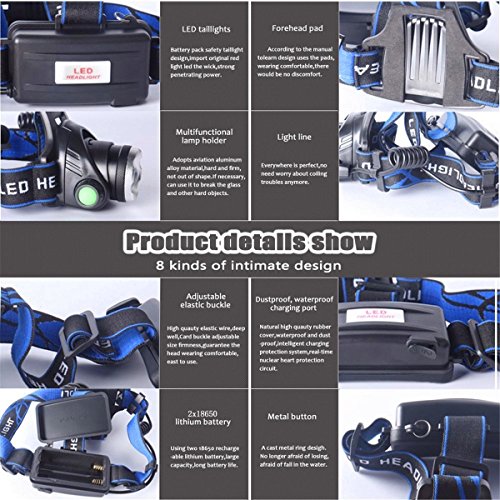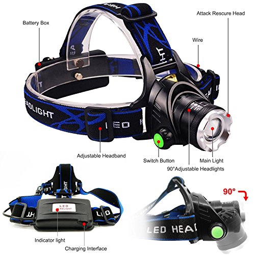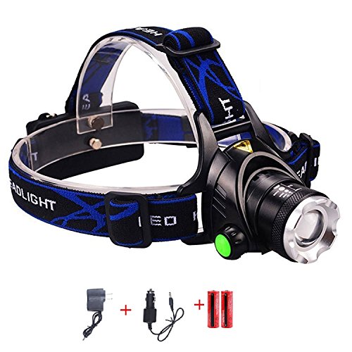N.CHOICE Zoomable 3 Modes Super Bright LED Headlamp with Rechargeable Batteries, Car Charger, Wall Charger