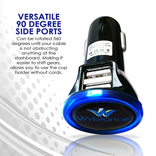 INTELLIGENT PRACTICAL NON OBSTRUCTIVE PREMIUM DESIGN - Unlike other Car Charger in the market, Wybrance USB Car Charger is designed with USB ports on the side rather than the front, thus making it easier to shift gears. The 90 degree side port allows you to use the cup holder without cords running over it. It's so versatile that this smart charger could be rotated 360 degrees until the cable is not obstructing anything at the dashboard.