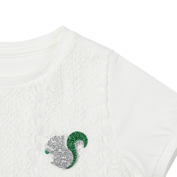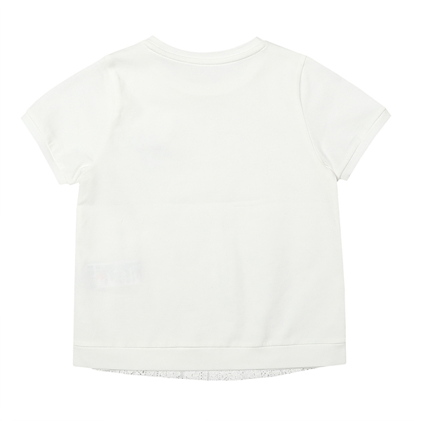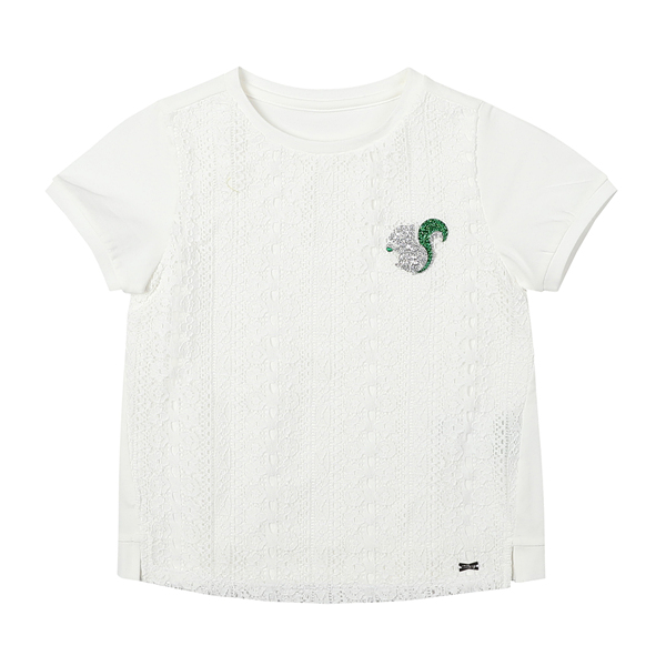 상세설명-기본라운드 화이트티셔츠에 앞부분을 전체적으로 레이스배색 처리를하여 여성스러운 느낌을 돋보이게 하는 상품입니다.