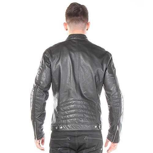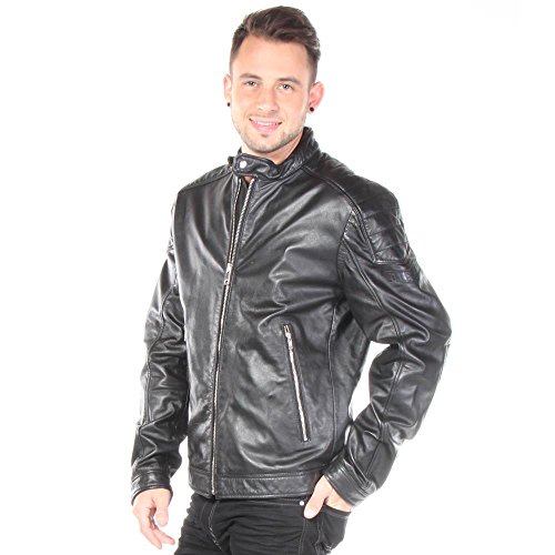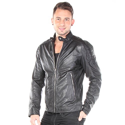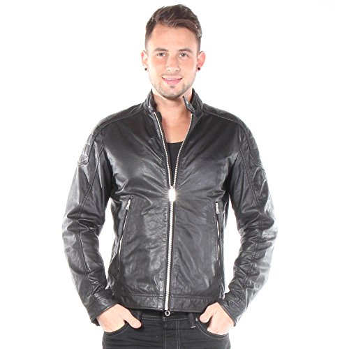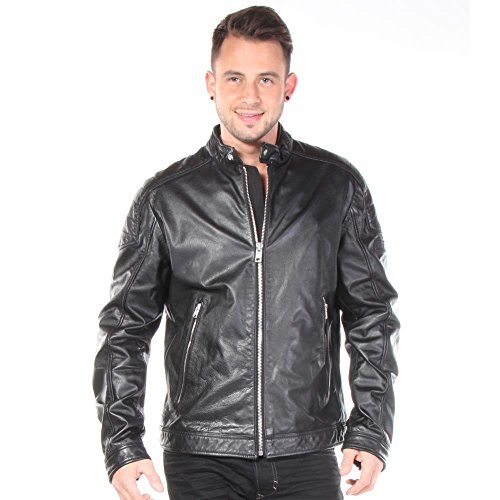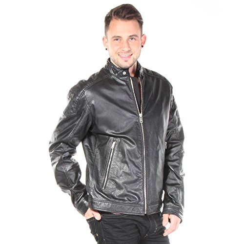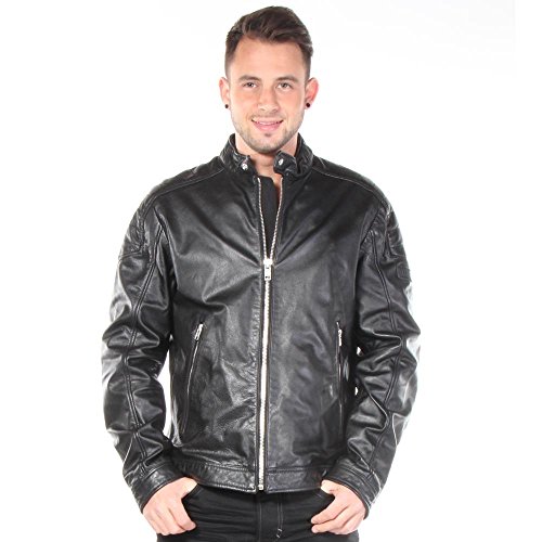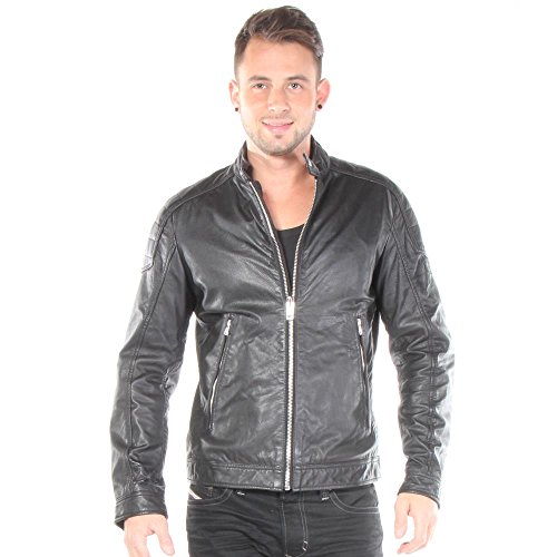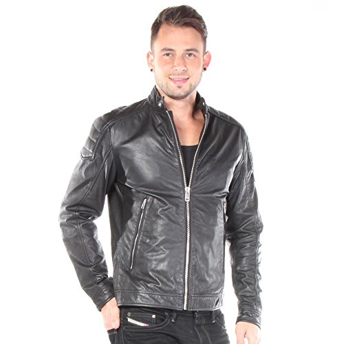 Studio : Diesel Men's Collections Publisher : Diesel Men's Collections Binding : Apparel Product Description Leather jacket sports a slim, contemporary fit. Moto-inspired stitching details throughout. Snap-tab collar. Long sleeves sport zip cuffs. Woven brand patch at left shoulder. Zip hand pockets. Interior snap pocket. Straight hem. Contrast interior lining. 100% cowhide leather; Application: 74% polyester, 26% nylon; Lining: 100% polyester. Leather specialist clean only. Imported. 0