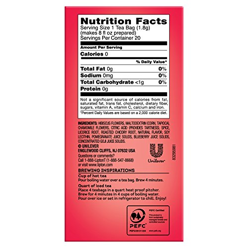 -. Binding : Grocery -. Brand : Lipton -. Feature : Uplifting when enjoyed hot or refreshing when enjoyed as an iced tea. / Conveniently packaged in 20 individually wrapped tea bags, Lipton Berry Hibiscus Herbal Tea delivers the sweet and tangy taste of Berries and Hibiscus that is naturally caffeine free. / Cup of Hot Tea: Pour boiling water over a tea bag and brew 2 to 3 minutes. Stir in milk if desired and sweeten to taste. -. IsAdultProduct : 0 -. Label : Unilever -. Manufacturer : Unilever -. Model : 10041000531726 -. NumberOfItems : 6 -. PackageQuantity : 6 -. ProductGroup : Grocery -. ProductTypeName : GROCERY -. PublicationDate : 2015-11-10 -. Publisher : Unilever -. ReleaseDate : 2015-11-10 -. Studio : Unilever -. Title : Lipton Herbal Tea, Berry Hibiscus, 20 Count (Pack of 6)