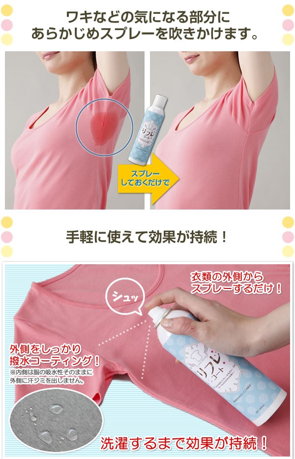 | 汗ジミが気になるワキや襟元にスプレーするだけ。撥水コーティングで汗ジミができるのを防止してくれるスプレーです。フローラルの甘い香りで使用感も○。消臭成分のカキタンニン配合。 |