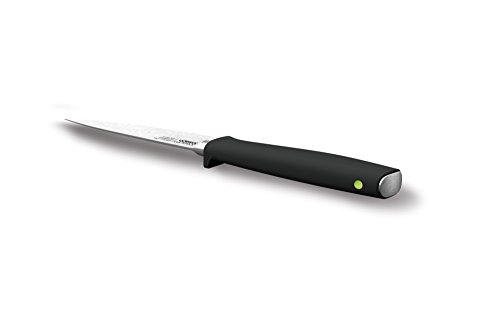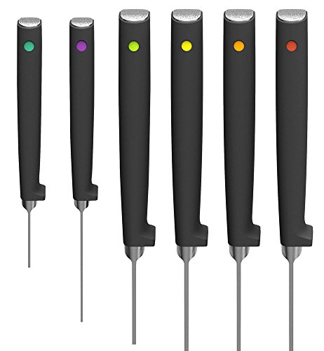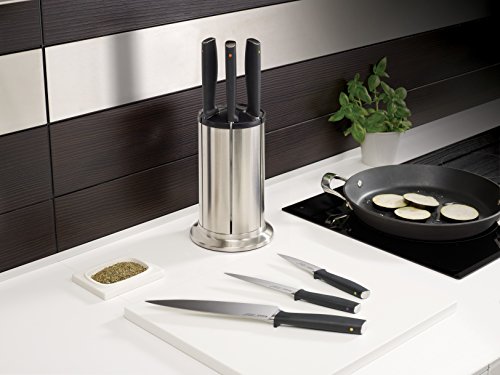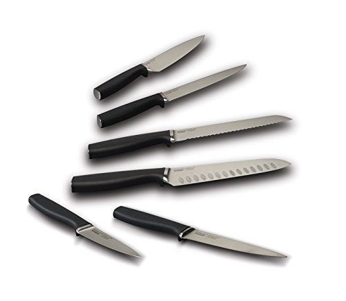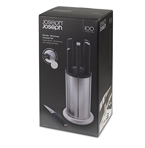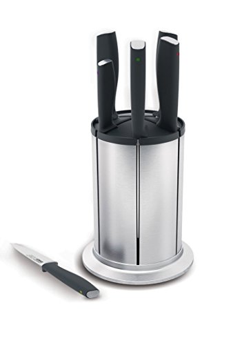 6-piece Knife Set, with rotating knife block, ice-hardened German stainless steel blades. Hand-finished , taper-ground blade edges provide a sharper, cleaner cutting action.