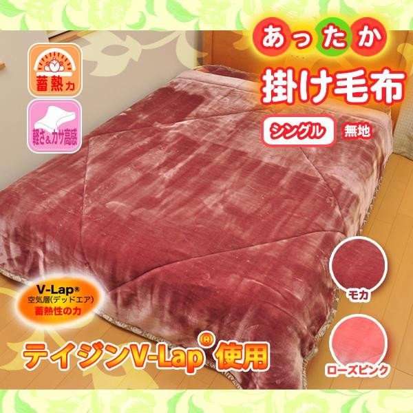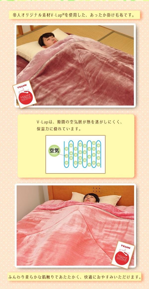 テイジンオリジナル素材のV-Lap(R)を使用した、あったか掛け毛布です。毛羽部の隙間の空気層が熱をにがしにくく、保温力に優れていますので、ふんわりやわらかな肌触りであたたかく、快適におやすみいただけます。また、ご家庭で手洗いが可能なので、汚れても手軽にお手入れができます。落ち着いた無地が、ベッドルームをシックに演出します。 |