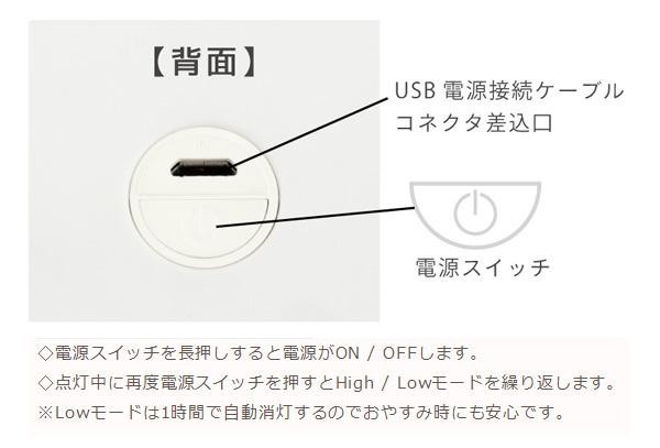 | 仕様 | 消費電力:1.1W 電圧:5V 電流:1A 電池容量:1800mAh 充電方式:USB、リチウム電池内蔵 充電時間:約2時間 ルーメン値:240lm 色温度:2700-3000K 連続点灯時間:Highモード 6-7時間、Lowモード 8-9時間 |