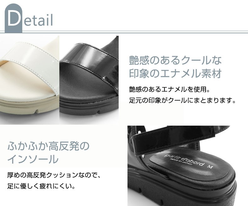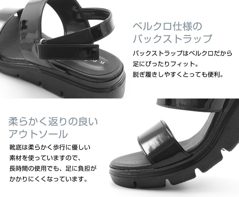 | ポイント | 【7,560円以上送料無料/あすつくOK】 ◆日本製 エナメル バックスストラップ フラット サンダル◆ 艶感のあるクールな印象のエナメルフラットサンダル。 ヒールは4.5cmで安定感があるので、ヒールが苦手な方でも安心。 バックのストラップはベルクロ仕様になっているので 足にぴったりフィットし、脱ぎ履きも楽々。 インソールはふかふか高反発クッションを使用。 足に優しく疲れにくくなっています。 アウトソールは柔らかく返りのいい素材。 足の負担を軽減してくれるので、長時間の使用でも安心です。 ※撮影は室内で行われており、ライティングにより実物と色味が少し異なる場合がございます。 ※採寸はスタッフが手作業で行っており、少々の誤差が生じる場合がございます。 | |||