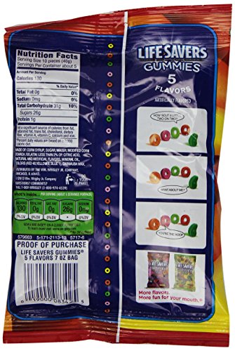 -. Feature : Life Savers 5 Flavors Gummies candy has the perfect assortment of fruity, gummy goodness: cherry, watermelon, green apple, strawberry, and orange. / Gummy candies that are a hole lot of fun. / Great for lunches, snacks, or to share with friends. / The classic American candy, originally designed to resemble a life preserver. / Package includes 7 ounces of Life Savers 5 Flavors Gummies gummy candies in a bag.