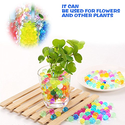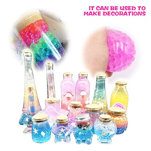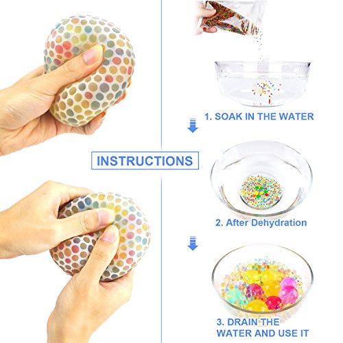 USE 1.Putting water pearls in a large container 2.Add water, The more water is, more round the beads will become 3. Put the small water beads into the water about 3-4 hours, the longer the time of placement,the bigger it will become 4. Put the big ones into the water about 1-2 days to become bouncy and beautiful jelly water beads