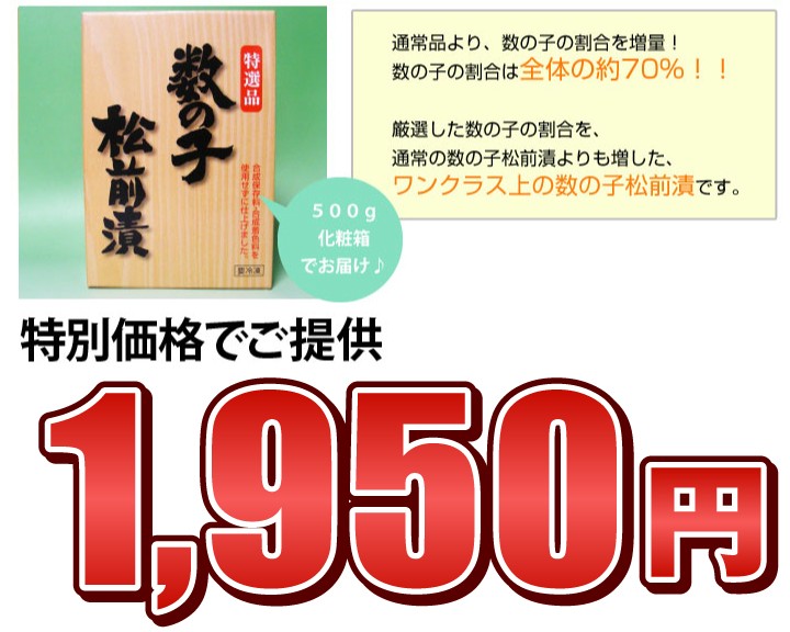 | 原材料 | 数の子(オランダ、ドイツ、その他)、醤油(大豆・遺伝子組換え不分別・小麦を含む)、するめ、砂糖、こんぶ、たん白加水分解物、食塩、唐辛子、魚節(さば、むろあじ、かつお、いわし)、ソルビット、調味料(アミノ酸等)、ph調整剤、増粘多糖類、酒精 ※合成着色料、合成保存料を使用していません。 |