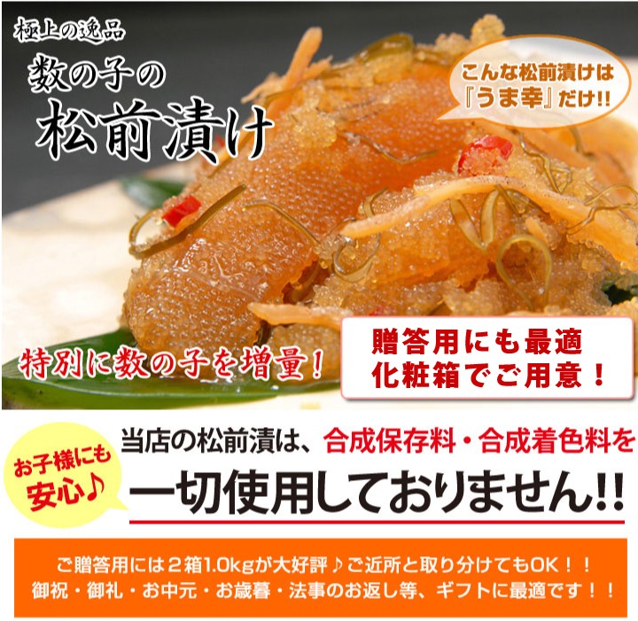 | 商品内容 | 数の子松前漬・・・・500g×1(化粧箱入り) |