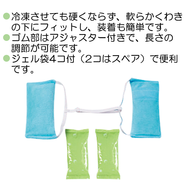 ●腕を通す部分と肩にかける部分がゴム製で、装着しやすく、ジェル袋部が脇の下にぴったりフィットします。