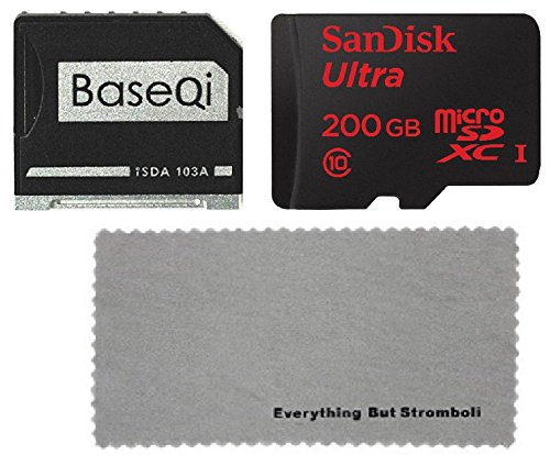 BASEQI aluminum microSD Adapter for MacBook Air 13" and MacBook Pro 13"/15" (Non-Retina) with SanDisk Ultra 200GB microSDXC UHS-I Card & Adapter, with Everything But Stromboli Microfiber Cloth