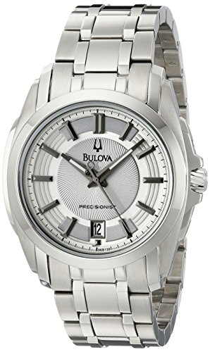 -. Feature : Men's Precisionist bracelet watch grey dial / Domed mineral crystal; Beveled dauphine hands with flat tip and tail, luminous filled middle / Stainless steel case and bracelet / Duet to 96B130 / Water resistant to 99 feet (30 M): withstands rain and splashes of water, but not showering or submersion