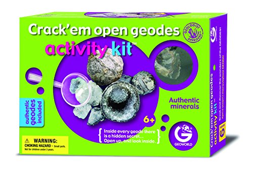 -. Binding : Toy -. Brand : Geoworld -. EAN : 0811170011822 -. Feature : Authentic minerals / Includes a geode cracking bag and magnifying glass / Includes a booklet to learn about the geodes / Be a geologist / Play and learn as you discover -. Label : Geoworld -. Manufacturer : Geoworld -. Model : ED366K -. MPN : 21120366 -. NumberOfItems : 1 -. PackageQuantity : 1 -. PartNumber : 21120366 -. ProductGroup : Toy -. ProductTypeName : TOYS_AND_GAMES -. Publisher : Geoworld -. Studio : Geoworld -. Title : Geoworld Activity Kit - Crack 'em Open Geodes -. UPC : 850780403665 -. Warranty : 30 day warranty against manufacturer defects