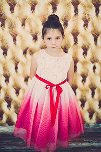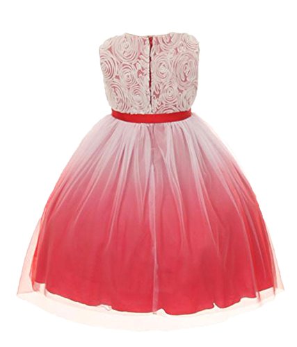Tea length girls dress has a sleeveless fitted bodice has a zipper back and a matching ribbon tie with removable rhinestone heart pendant. Tulle Rosette Bodice has a tulle skirting overlay, and lining with tulle trim for a soft full look. Available in Ombre Fuchsia, Purple, or Aqua. Girl Sizes 2-12. 100% Polyester Tulle. Hand wash. Made in the USA.Feature