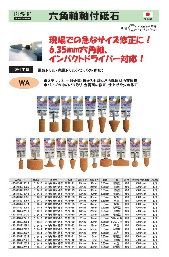 WA ステンレス・一般金属・焼入れ鋼などの難削材の研磨用。パイプの中のバリ取り・金属面の修正・仕上げや穴の修正。
