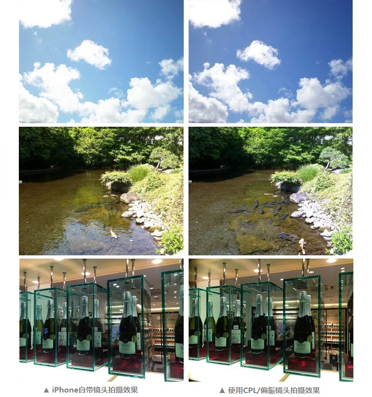 偏振镜:用于消除偏振光、增加色彩浓度,加深天空蓝色,突出白云消除非金属表面如玻璃或水面的反射光。也可以减少大气泛雾在风景照中引起的柔焦,但不改变整个画面的色调均衡。