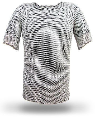 Product Description The wearing of chain mail has been an effective means of protection in combat and war of countries. Its use dates back to the Creeks and early Roman empire where warriors and legionnaires donned metal plate. The medieval era knights and most remembered for their elaborate chain mail in different designs. the period of chain mail armor runs from about the early 1300's to about the mid to late 1500's. You are bidding a high quality Chain Mail shirt and coif set. Zinc plated steel construction. Weights 32 pounds. Will fit up to 48" chest. 17" from underarm to wrist, 34" from top of shoulder to thigh. 18 gauge and 1/4" ring size. 0