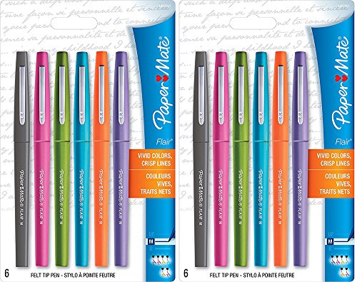 -. Binding : Kitchen -. Brand : Paper Mate -. Color : .2units (6 Pack) -. EAN : 0079946053791 -. Feature : Point Guard prevents the tip from fraying even after repeated use / Quick-drying, water-based ink resists smearing / Specially designed ink will not bleed through paper / Medium point produces bold and expressive lines -. Label : Paper Mate -. Manufacturer : Paper Mate -. NumberOfItems : 1 -. PackageQuantity : 2 -. ProductGroup : Home -. ProductTypeName : HOME -. Publisher : Paper Mate -. Size : .2Units (6 Pack) -. Studio : Paper Mate -. Title : Paper Mate OzdBwu Flair Felt Tip Pens, Medium Point, Assorted Colors, 6 Pack (2 Units) -. UPC : 079946053791