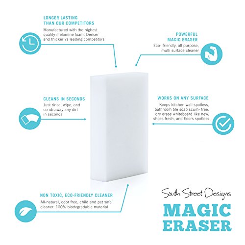 The Multi-Surface Magic Sponge Melamine foam can leave any surface clean and spotless. It's perfect for moms or anyone who wants to make cleaning a breeze! Tired of brands that don't work? Use an all purpose multi surface magic eraser! ? Its nano three-dimensional structure and micro-scrubbers remove tough dirt, stains and rust better than the leading all-purpose cleaners! ? 9x denser than competition! Lasts longer and clean better than leading magic eraser or melamine foam brands. ? Eco Friendly magic eraser - made of 100% biodegradable materials. ? Easy on sensitive skin - Our magic cleaner is non-toxic - no detergent, additives, or harmful chemicals added. ? All-in-one cleaner - No need to buy different cleaners. Use the SSD magic eraser to clean your home, office, cars, appliances, electronics and so on! Use the magic cleaner to remove the toughest dirt, grime, and permanent mark Our all purpose multi surface cleaner is a melamine sponge perfect for cleaning dirt and grime on kitchen wall, bathroom tile, car, computer, dry erase board whiteboard, furniture, garment, shoes, and floor! Other uses include: ? Remove soap scum from your bathroom's floor, walls, mirrors, and glass doors ? Remove stains or tarnish from sinks, cookware or silver utensils ? Clean rust, mold and mildew build-up ? Removes almost any stains in your car - including your car tires! ? Remove pen or marker stains (chalk markers, permanent markers, ballpoint markers, etc) from almost ANY surface ? Remove rust and corrosion build-up on your kitchen or bathroom's pipes. ? Remove stains in your office! Cleans computers, keyboard, whiteboard, fax machines, chair and desk What's the secret to our magic eraser? The secret of our magic cleaner is the melamine foam. Its powerful micro-abrasive microscrubbers cleans the toughest stains - just add water! 0