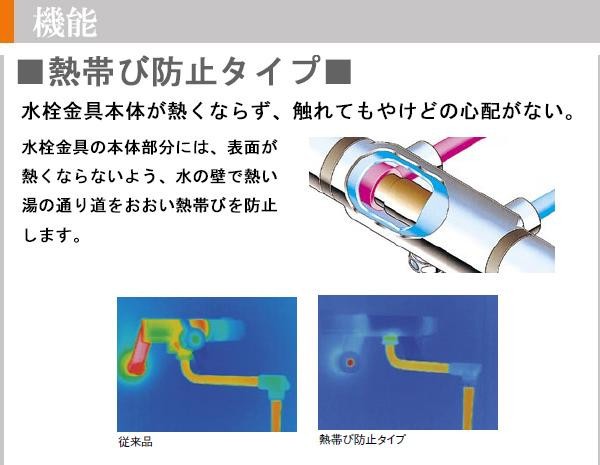 ハンドル・レバーにクリック機構(ハンドルやレバーの動きに合わせてカチッと音が鳴り操作を助ける機能)を採用。断熱仕様で水栓金具本体が熱くならず、触れてもやけどの心配がありません。 |