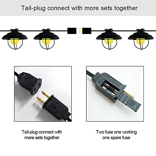 LINKABLE PATIO STRING LIGHTS : Total Length of the string of lights is 8.5 Feet. 1.97 ft lead with male plug, 11.4 inches spacing between bulbs, 6 inches tail with female connector. Can connect multiple strands together, connect up to 8 sets of lights
