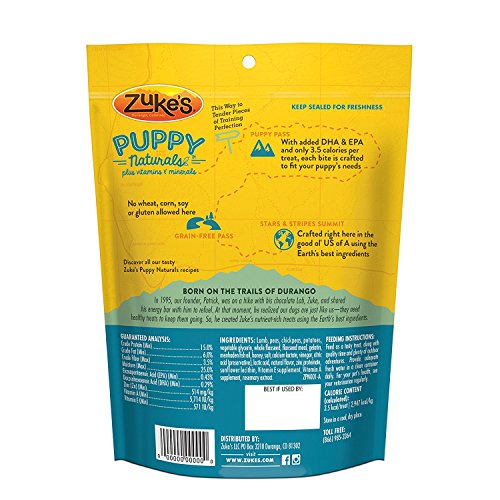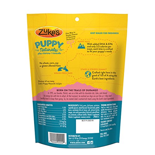 -. Binding : Misc. -. Brand : Zuke's -. Feature : New packaging, same trail-tested recipes. For a limited time, packaging look may vary. / Protein-packed recipe supports growing puppies / DHA & EPA help support healthy brain development / Rich in vitamins A, C and E / Grain-free recipe is ideal for puppies sensitive to grains -. Label : Zuke's -. Manufacturer : Zuke's -. MPN : 134120-PHIL-PAR -. PackageQuantity : 1 -. PartNumber : 134120-PHIL-PAR -. ProductGroup : Pet Products -. ProductTypeName : PET_SUPPLIES -. Publisher : Zuke's -. Studio : Zuke's -. Title : Zuke's Mini Naturals Dog Treats