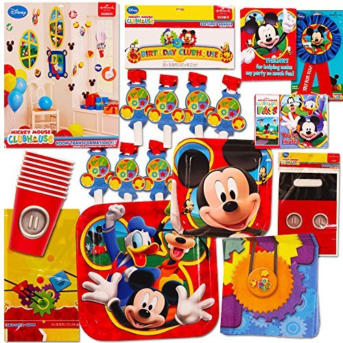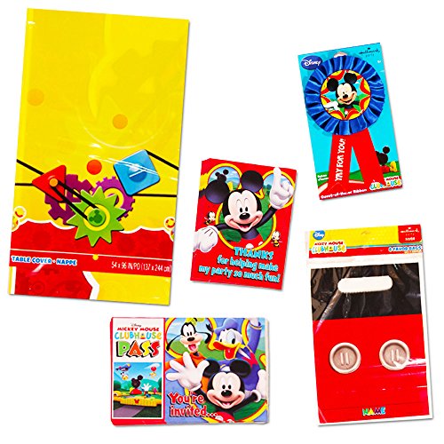 -. Feature : Disney Mickey Mouse Party Supplies Value Set -- Party Favors, Table Cover, Plates, Cups, Napkins, Invitations and More! / This Disney Mickey Mouse birthday party supplies set includes everything you need to throw the ultimate Mickey Mouse party. / Disney Mickey Mouse Party Supplies and Decorations set includes: 8 Mickey Mouse cups, 8 Mickey Mouse full-size plates, 8 Mickey Mouse dessert plates, 1 Mickey Mouse Tablecloth, 16 Mickey Mouse napkins. / Also includes Mickey Mouse Party Favor Pack: 8 Mickey Mouse treat bags, 8 Mickey Mouse blowouts, over 30 Mickey Stickers (2 sheets). Plus a special button for the birthday child to wear during the party. / Includes 8 Mickey Mouse invitations with envelopes and 8 Mickey Mouse thank-you postcards. This Mickey Mouse party supplies set has everything you need for an unbeatable P.R.Ice! Includes everything shown in image -- please note this party pack does not include a banner.