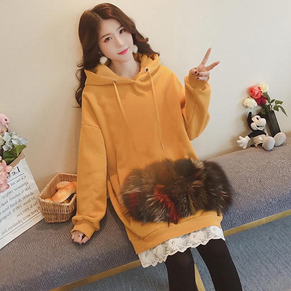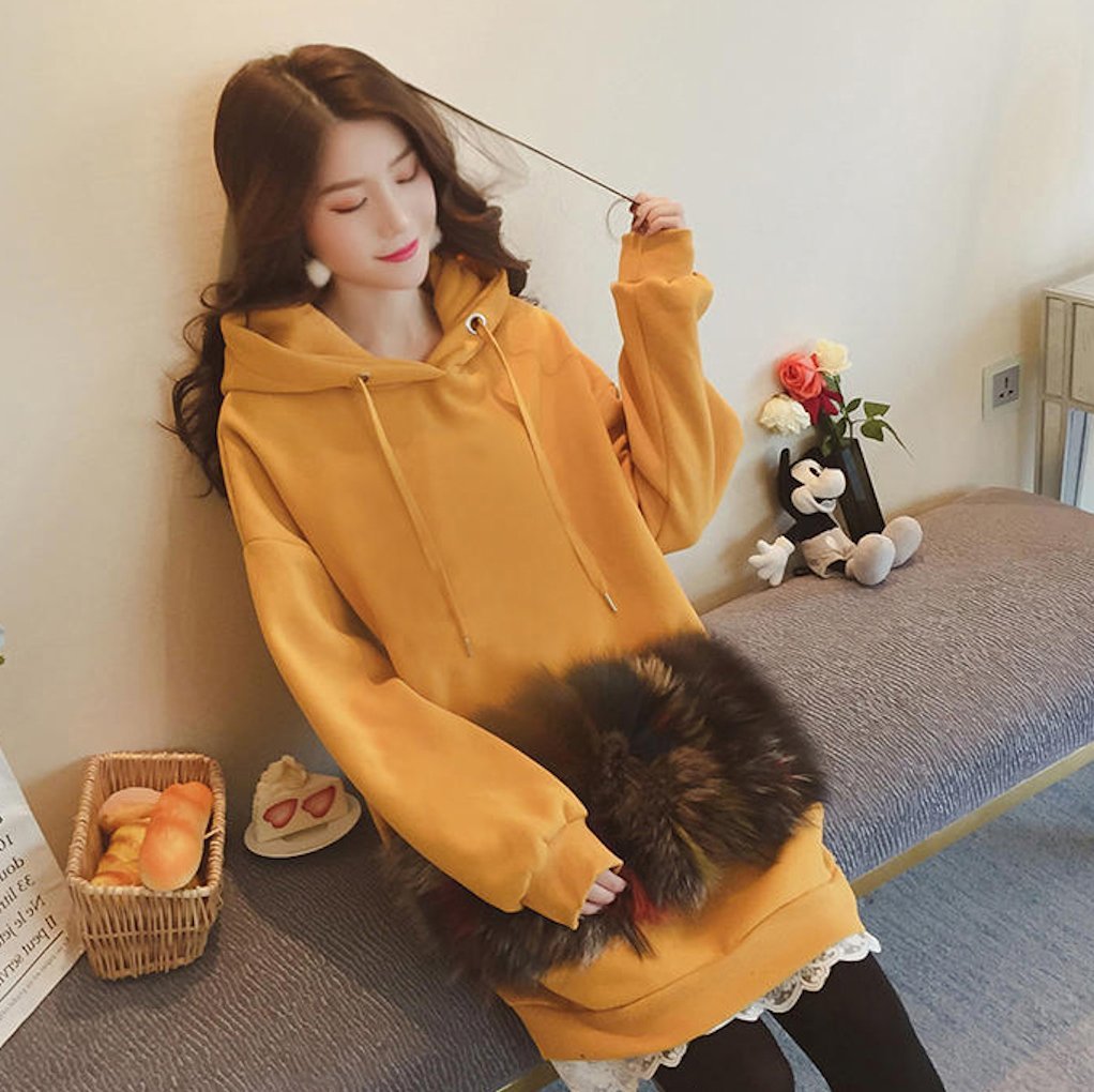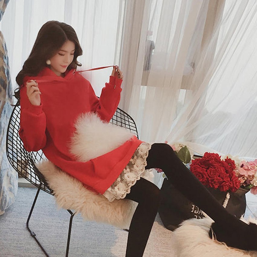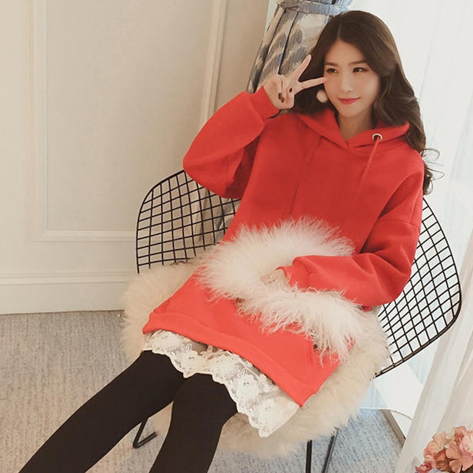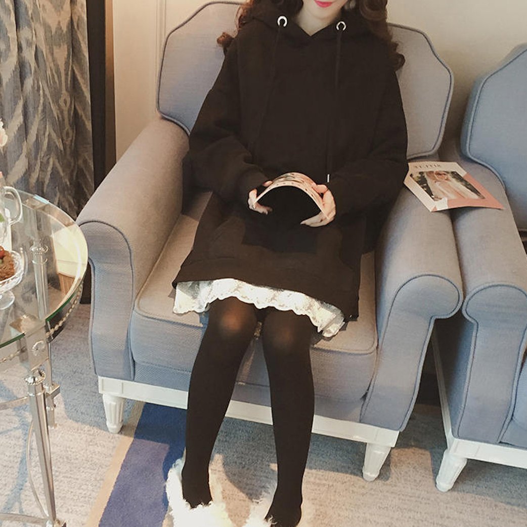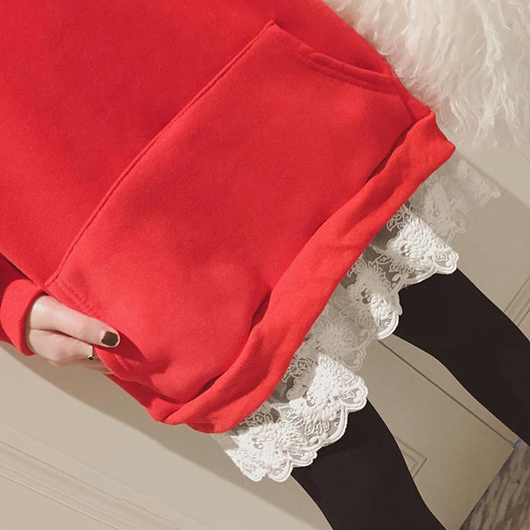 ゆったり プルオーバー 裏起毛 フード付 レース裾 パーカー ワンピース トップス フリル レイヤード オーバーサイズ カジュアル 秋冬