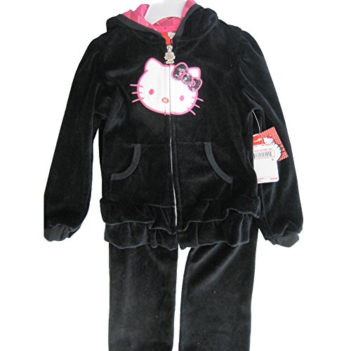 A cute casual 2 piece set with the famous Hello Kitty face applique and sequined bow. The black velour outfit includes a hooded jacket sweater with zipper closure and front pockets. The matching pants complete the outfit. Your girl will surely enjoy this soft and pretty set.Feature