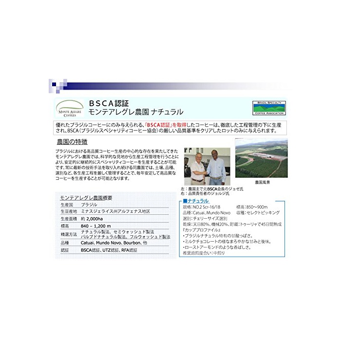 특징 / 브라질에서의 고품질 커피 생산 중심적인 존재를 과연 온 몽《데아레구레》농원에서는,과학적인 견지에서 생산 공정 관리를 하는 것으로 의해안정 적으로 계속 적으로 고품질인 커피를 생산하는 일이 가능합니다.BSCA인증은,BSCA(브라질 스페《샤리티코히》협회)의 엄격한 품질 기준을 뛰어 넘은 로또 만으로 받습니다.