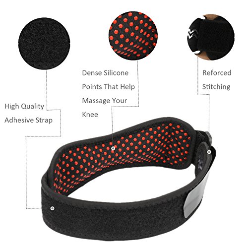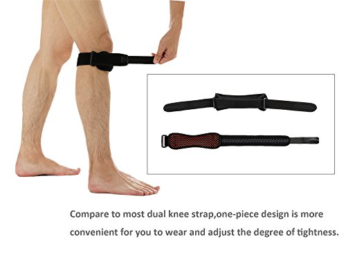 -. Feature : PATELLA PROTECTION:Our Knee Strap provide your knees support and help absorb shock to prevent knees injuries when doing different exercises. It can also reduce the pain associated with patellar tendonitis, jumper's knee, runner's knee, chondromalacia, Osgood-Schlatter disease and patella tracking. / HIGH QUALITY MATERIAL:Polyester & Nylon form a durable, resilient covering that is resistant to pilling. Sweat absorbing Fabric prevent from falling easily. The soft & light silica gel in different places provide patella more comfortable support, avoiding patella suffering too much weight. / CONVENIENT USAGE:Unlike most dual knee strap,one-piece design is more convenient for you to wear and adjust the degree of tightness. / MULTIFUNCTIONAL SILICA GEL:The silicone padding ensures a more comfortable wearing experience. Dense red silicone points help massage and alleviate your knee pain. Added Anti-Slip silicone strips inside can make the compression is uniform throughout and stays in place for any physical activity.PURCHASE WITH CAUTION FOR THOSE WITH SILICONE ALLERGIC CONSTITUTION. / REINFORCED SEAMING: Every joint of our knee strap is elaborately sewed with high quality seaming threads, which brings the product an EXCELLENT TEAR RESISTANCE. High quality fabric and stitching make it more durable.