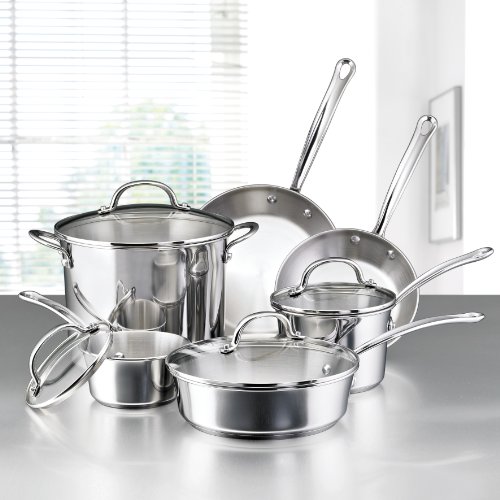 Sleek, durable and dependable, the Millennium Stainless Steel Tulip Series 10-piece Cookware Set from Farberware delivers unbeatable performance and brings elegance to every stovetop. The versatile covered saucepans are ideal not only for whisking turkey gravy or Alfredo sauce, they also work well for cooking oatmeal or poaching eggs. Simmer hearty beef stew or boil big batches of macaroni in the deep, sturdy stockpot. Make restaurant-quality entrees in the skillets or saute pan by searing steak or browning chicken, then deglazing with wine.