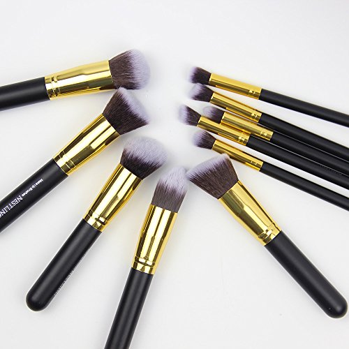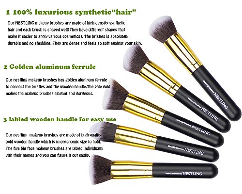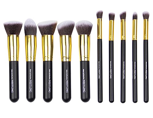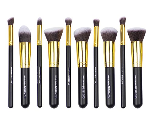 -. Binding : Health and Beauty -. Brand : Nestling -. Color : Golden Black -. EAN : 6136797606140 -. Feature : 100% Brand New and High Quality; Brush hair : Synthetic Hair / Color: Black, Silver;Great for Applying Foundation, Blush, Powder / Real Techniques brushes are available for high-definition results and ultra-easy handling. / The ultra-soft blusher brush is the expert to define and contour your cheeks.Rouge was never so easy to apply and blind. High Definition results also define the cheeks. / Suitable for beginners as well as professionals!So you have your brush at hand, and you can also set perfect way to show it on your dressing table. -. IsAdultProduct : 0 -. Label : Shenzhen nestling Technology Co. Ltd. -. Manufacturer : Shenzhen nestling Technology Co. Ltd. -. MPN : 4990109 -. PackageQuantity : 1 -. PartNumber : 4990109 -. ProductGroup : Beauty -. ProductTypeName : BEAUTY -. Publisher : Shenzhen nestling Technology Co. Ltd. -. Studio : Shenzhen nestling Technology Co. Ltd. -. Title : Nestling®10 PCS Premium Professional Kabuki Makeup Brush Set Cosmetics Foundation Blending Blusher Eyeliner Eyeshadow Face Powder Brush Tool Kit (Golden Black)