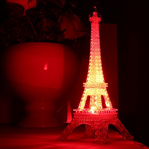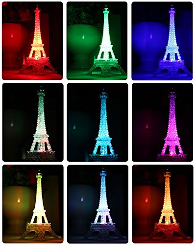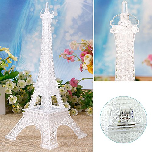 -. Feature : Powered by 3*LR44 battery, battery included and be replaceable / Cute mini LED Eiffel tower night light, ON/OFF switch, easy push button control / Energy saving, low power consumption, seven colors change by turns automatically / Fantastic desklamp Cake Topper or Table Décor, special for kids,adults,families and friends / Used in bedroom,home,bars,cafes,restaurants,wedding, party and other romantic places, adding much more joy for your life