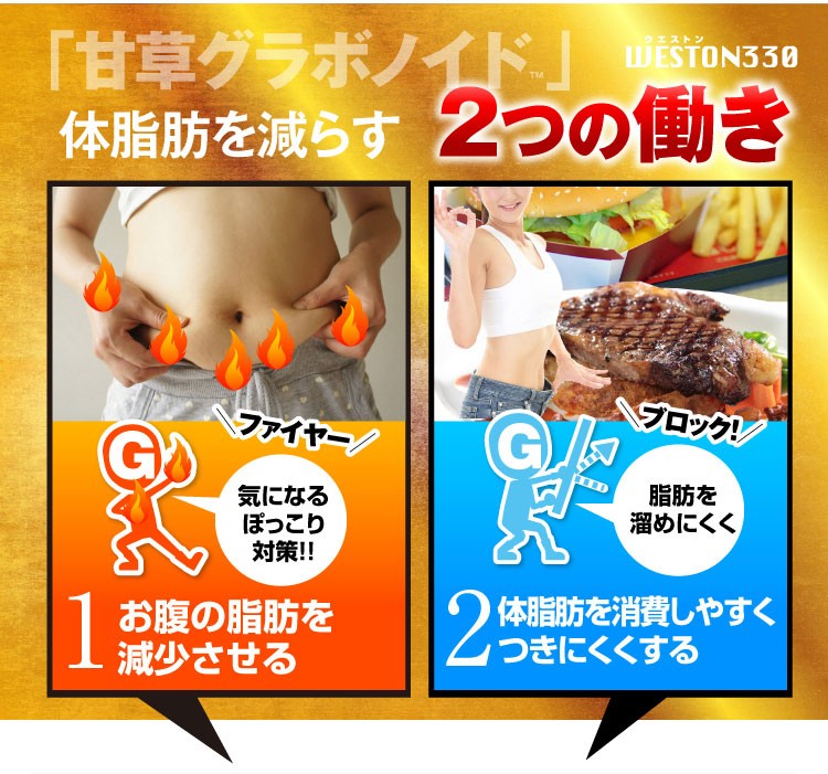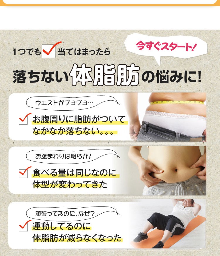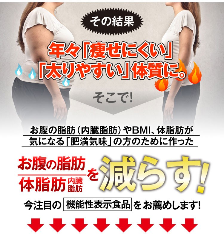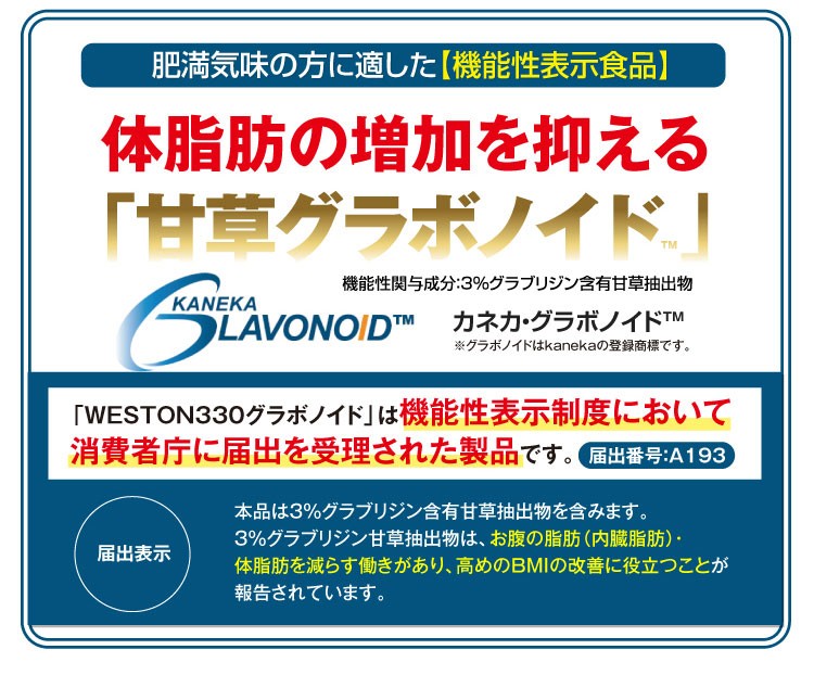 | こんな方へ | 本品は甘草由来グラブリジンを含みます。 甘草由来グラブリジンは、お腹の脂肪(内臓脂肪)・体脂肪を減らす働きがあり、高めのBMIの改善に役立つことが報告されています。体脂肪が気になる方、肥満気味の方に適しています。 |