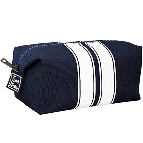 - PRACTICAL AND COMPACT. This large size cosmetics bag is crafted from a robust waterproof nylon material featuring high quality sturdy zipper, one internal zipped pocket, lateral logo patch, dual stripes pattern, secured with metallic snap closures