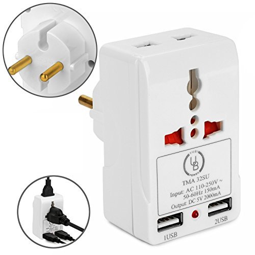 Perfect travel adapter with 2 universal outlets (2 prong and 3 prong) and a 2.0 USB charging ports