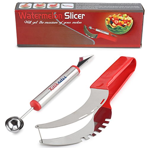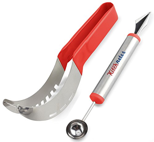 Premium Watermelon Slicer Set By Kitchenetes - Stainless Fruit Carving Kitchen Utensil Kit - Includes Watermelon Slicing Tool & Fruit Carving Knife/Spoon - Great For Fruit Salads, Desserts & More!