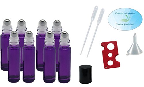 10ml Purple Glass Roller Bottles with Stainless Steel Balls (Pack of 8), Pipettes, Funnel, and Essential Oil Bottle Opener