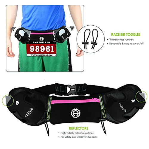 - Feature : Hydration Belt made of soft lightweight neoprene material that doesn't bounce or chafe, and dual-adjustable elastic nylon straps with strong buckle clip that fits most hip sizes (27" to 40") as it is designed to be worn low on the hips / Includes two 10-ounce BPA-free leak-proof water bottles, and two removable race bib toggles / Water and sweat-resistant pouch (to store your phone, gel bars, etc.) with separate inner pockets for keys/cards to keep it from scratching your valuables (pouch is 3.5" tall and 6.7" wide) / High-visibility reflectors on front & side/back to keep you safe especially during an evening run / Guaranteed: 1-Year Warranty - a Free No-Hassle Replacement Process!