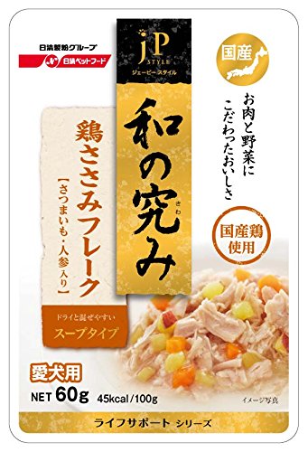 素材構成:水分(88.0%以下)、粗タンパク質(10.0%以上)、粗脂肪(0.3%以上)、粗繊維(0.1%以下)、粗灰分(1.0%以下)、エネルギー45kcal/100g