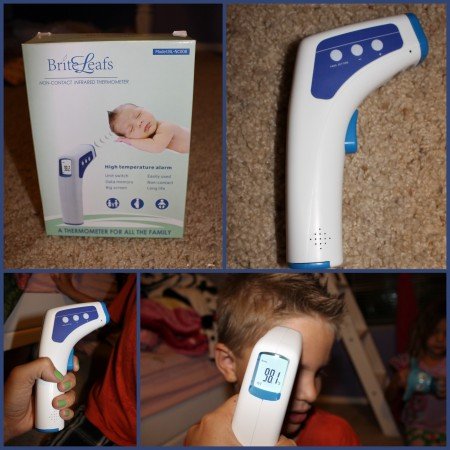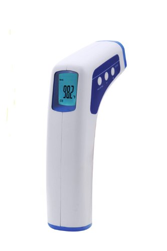 This BriteLeafs non-contact infrared (IR) clinical thermometer provides a simple, expedient, and accurate way for initial fever screenings by taking the surface temperature of areas on the face such as the forehead or tear ducts. It obtains the body temperature reading with 0.3 degree accuracy in less than 1 second through a click. The BriteLeafs thermometer features an intuitive guidance system to secure positioning and confirm accurate readings. Temperatures (Fahrenheit or Celsius) are displayed on a huge back-lit LCD screen for easier reading even in total darkness. Adjustable audio alarm will alert you if the temperature is too high. Since there is no contamination risk, one can immediately start again to scan the temperature of other family members or individuals without having to disinfect or changing the tip. It was designed specifically for forehead temperature detection from a 1"-4" (5-15cm) distance with an 89-109 F(32.0-43.0C) temperature range. Unlike other IR thermometers that only measure surface temperature, It is clinically calibrated to convert the forehead temperature reading(external surface) into internal body temperature which is one of the most important vital signs for human being. It can also store 32 temperature readings for future reference. The bright back-lit LCD screen displays readings even in darkness. A sleeping baby or patient will not be disturbed by the thermometer as it is used nor will it cause any discomfort if they are awake. For public health authorities, it provides a simple, quick, Non-contact, and non-invasive way to perform preliminary mass-screening for H1N1 fever (swine flu) infection symptoms (body temperatures above 98.6 degrees Fahrenheit or 37 degrees Celsius). It can take over 100,000 readings on a single set of 2 AA batteries (included). With its rugged, impact and water resistant design, It is able to take over 3,000,000 measurements in the product's lifetime , Fahrenheit readings.