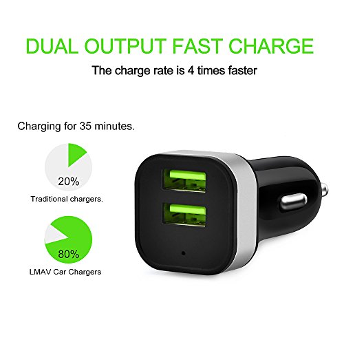- Car Charger Security Protection :Intelligent circuit design protects against short circuiting, overheat, overcurrents, and over-charging, flame retardant material,ensuring superior performance and reliability. The green LED light let you easy to see two USB ports of car charger at night.