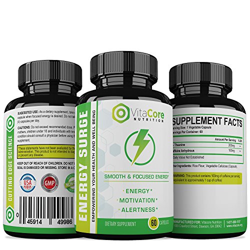 HEALTHY INGREDIENTS FOR MAXIMUM RESULTS! – The VitaCore Energy Surge contains L-Theanine, which is a constituent of green tea. It has been used for millennia as a unique way to feel rejuvenated, calm and alert. L-Theanine is ideal for stress-relief. In addition, Caffeine Anhydrous, which is dehydrated natural caffeine, will help you feel energized and focused.