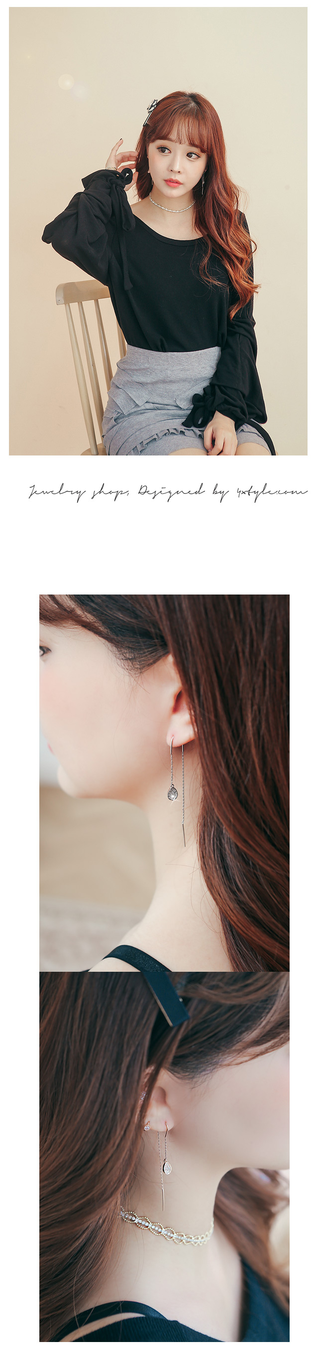 팬던트 반대쪽에 있는 침부분을 귓볼에 꽂고 뒤로 돌려서 넘겨주면 간단하게 착용하실 수 있어요.
